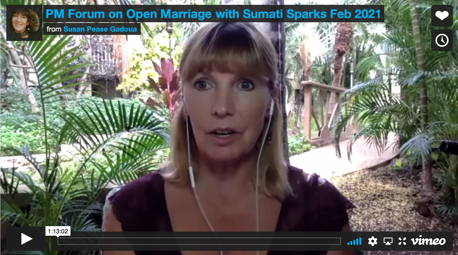 In this Parenting Marriage Forum with founder, Susan Pease Gadoua, Open Marriage Relationship Expert, Sumati Sparks, shares her wisdom on how to navigate the delicate task of opening up one's marriage after deciding to transition to a Parenting Marriage. Sumati teaches couples new ways to hold these outside relationships as well as how to transform jealousy into love.